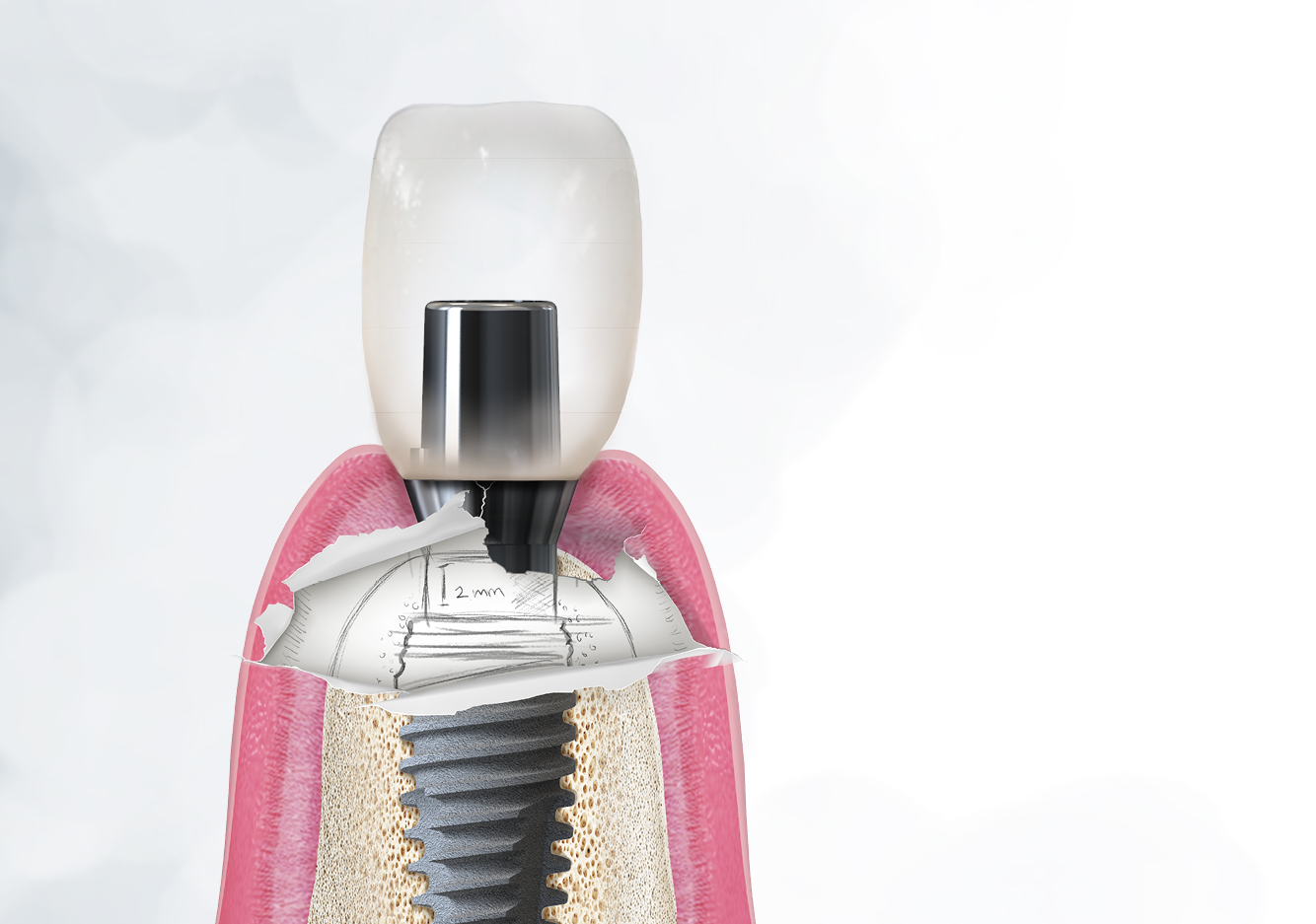 Die Idee dahinter: ein beständiges knöchernes Siegel rund um das Implantat und darüber, das sich niemals abbaut. Denn haben wir gesunden Knochen, so haben wir auch gesunde Schleimhaut.